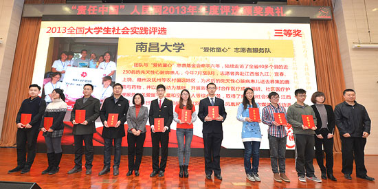 人民網(wǎng)北京1月15日電 (記者 張葳)1月15日,2013全國(guó)大學(xué)生社會(huì)實(shí)踐評(píng)選活動(dòng)舉行頒獎(jiǎng)和座談活動(dòng),獲獎(jiǎng)大學(xué)生代表上百個(gè)團(tuán)隊(duì)發(fā)表了倡議書(shū),號(hào)召全國(guó)大學(xué)生們?cè)谏鐣?huì)實(shí)踐中做到“行動(dòng)落實(shí)處,愛(ài)心不間斷”,經(jīng)常性、持續(xù)性地走進(jìn)社會(huì)、服務(wù)基層,拒絕形式主義。