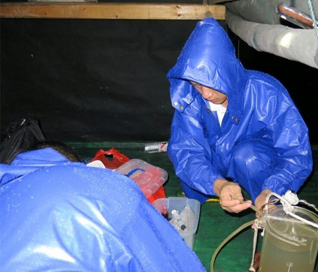 7月10日夜晚,隊(duì)員們冒著大雨進(jìn)行水樣分析