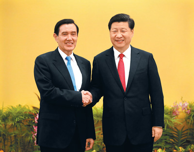 11月7日下午,中共中央總書記、國家主席習(xí)近平同臺灣方面領(lǐng)導(dǎo)人馬英九在新加坡會面,就進(jìn)一步推進(jìn)兩岸關(guān)系和平發(fā)展交換意見。新華社記者蘭紅光攝