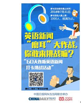 2018這個(gè)夏天,中國(guó)日?qǐng)?bào)網(wǎng)攜手當(dāng)當(dāng)網(wǎng)推出首期“60天連聽(tīng)英語(yǔ)新聞打卡達(dá)人活動(dòng)”,你不僅能通過(guò)中國(guó)日?qǐng)?bào)網(wǎng)外籍專家的純正英音、美音了解每天世界上的精彩趣聞,還可以考驗(yàn)自己的毅力和自律性。60個(gè)工作日,三個(gè)月的時(shí)間,看似很短,但是你的努力,時(shí)間看得到!跟上我們這60天的步伐,相信您的英語(yǔ)能力會(huì)日益精進(jìn)。
