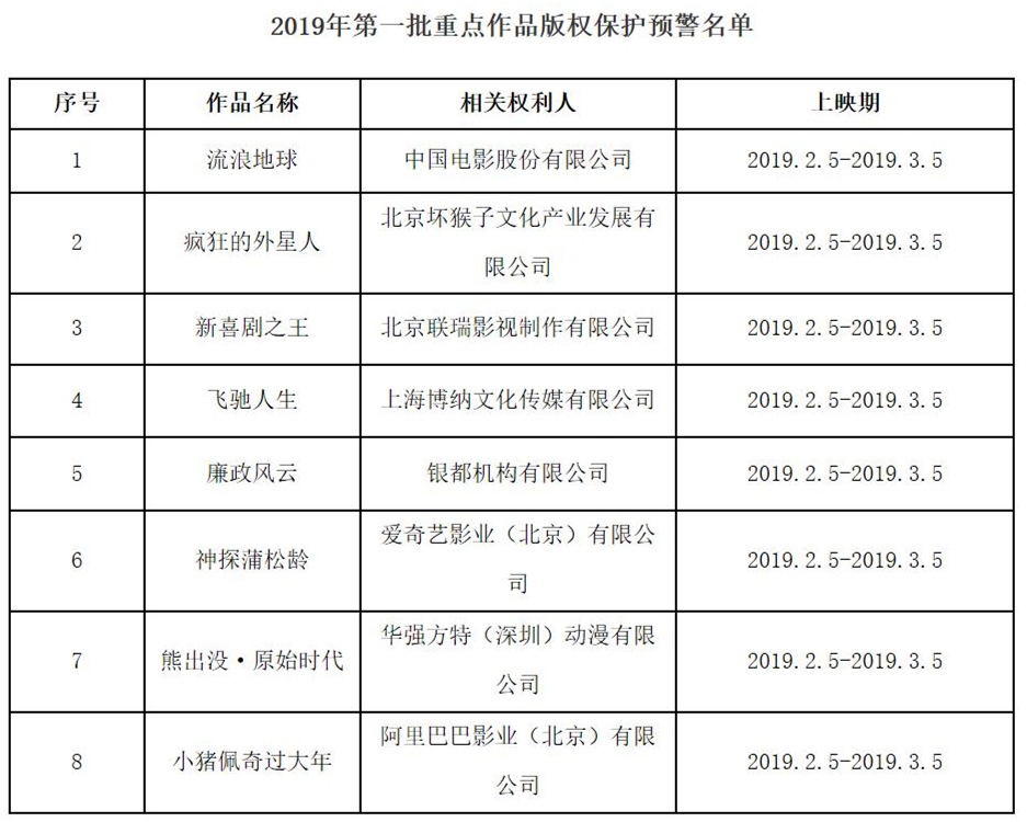 2019年度第一批重點(diǎn)作品版權(quán)保護(hù)預(yù)警名單,《流浪地球》等賀歲片在列。(國家版權(quán)局)