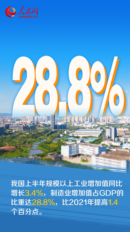 上半年,在各地區(qū)各部門共同努力下,盡管面臨疫情沖擊,產(chǎn)業(yè)鏈供應(yīng)鏈日益穩(wěn)定暢通,工業(yè)經(jīng)濟(jì)迅速扭轉(zhuǎn)了下滑態(tài)勢,實(shí)現(xiàn)了恢復(fù)增長。國新辦7月19日舉行發(fā)布會(huì)介紹,今年上半年,我國規(guī)模以上工業(yè)增加值同比增長3.4%,規(guī)模以上制造業(yè)增加值同比增長2.8%,制造業(yè)增加值占GDP的比重達(dá)28.8%,比2021年提高1.4個(gè)百分點(diǎn)。