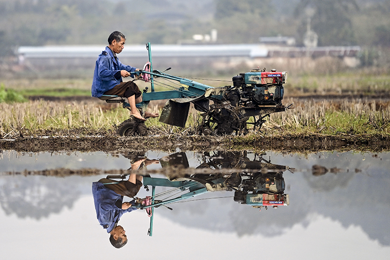 2月17日,廣西欽州欽北區(qū)大寺鎮(zhèn)農民在翻耕稻田。新華社記者 張愛林攝